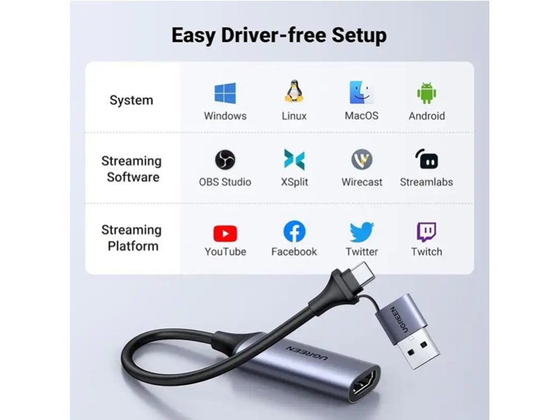 USB kartica za snimanje je pogodna za emitovanje uživo, snimanje, uređivanje i prenos video zapisa u visokoj rezoluciji na OBS, XSplit, Potplayer, QuickTime Player, USB Camera Viewer i drugim aplikacijama.