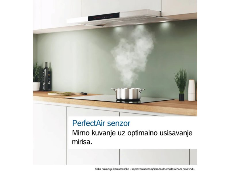 Karakteristike | Energetski razred A+ Maksimalni protok vazduha 722 m³/h Broj brzina 5 (3 standardne + 2 intenzivne) EcoSilence Drive motor PerfectAir senzor LED osvetljenje 2 x 3 W Upravljanje na dodir (DirectSelect) PowerBoost funkcija Mogućnost rada u režimu odvođenja vazduha ili recirkulacije Home Connect podrška Boja bela staklena površina |