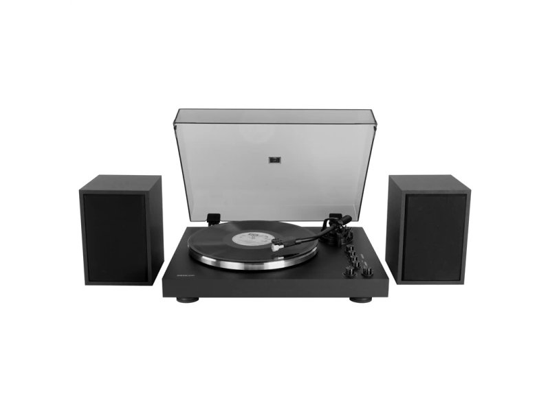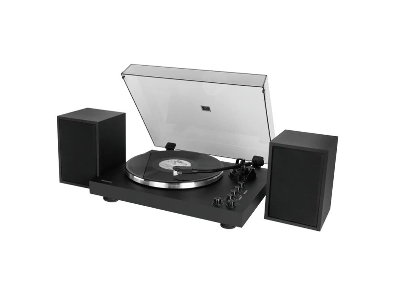 | Karakteristike | Gramofon sa ugrađenim zvučnicima Pogon: Remenski (belt drive) Motor: DC servo motor Brzine reprodukcije: 33 1/3 i 45 o/min Automatsko zaustavljanje ploče: Da Poklopac protiv prašine: Da Zvučnica Tip: MM (Moving Magnet) Izlazni napon: 2,5 mV ±3 dB (1 kHz) Preporučeni pritisak igle: 3,5 g ±0,5 g Težina zvučnice: oko 5 g Ugrađeni stereo zvučnici: 2 × 15 W Odnos signal/šum: Gramofon: >20 dB USB/SD/Bluetooth režim: >40 dB Bluetooth prijemnik i predajnik USB ulaz reprodukcija i digitalizacija ploča SD kartica reprodukcija MP3 fajlova FM radio ugrađen RCA linijski izlaz za povezivanje na eksterno pojačalo Izlaz za slušalice Napajanje Napon: 100–230 V ~ 50/60 Hz Maksimalna potrošnja: oko 36 W Dimenzije i težina Gramofon: 460 × 357 × 118 mm Zvučnici: 218 × 157 × 151 mm Ukupna težina (gramofon + zvučnici): oko 9,2 kg |