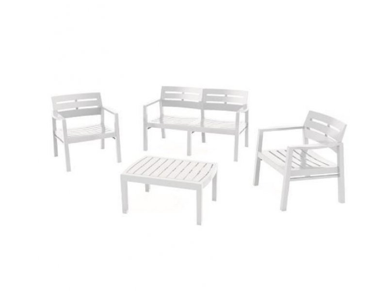 | Karakteristike | Karakteristike Dimenzija stolice (DxŠxV): 72,5x65x74,5 cm Dimenzija dvoseda (DxŠxV): 133x65x74,5 cm Dimenzija stola (DxŠxV): 78x55x38 cm Težina seta: 29kg Boja plastike: bela Materijal jastuka: poliester |
