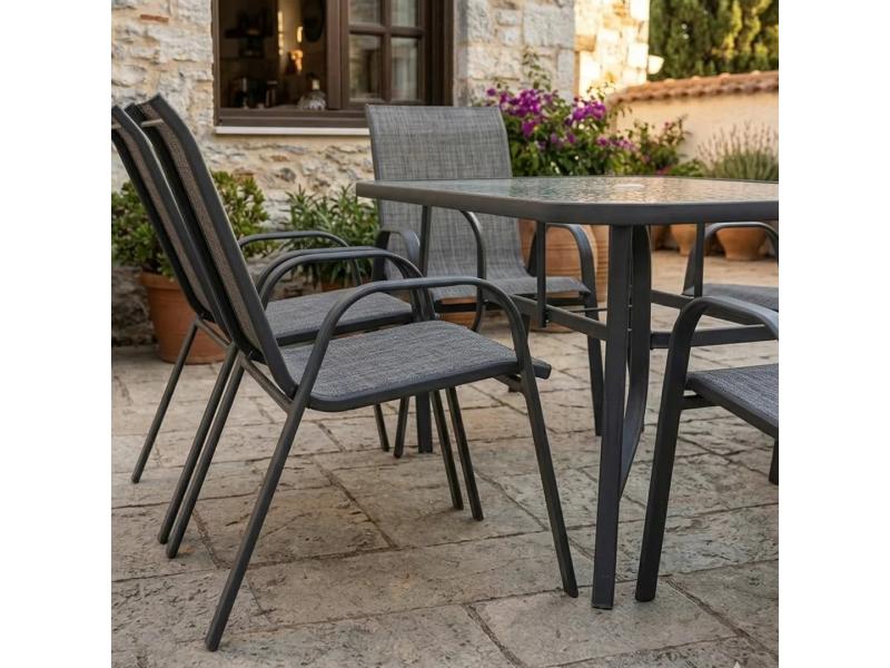 Postavljena na stare kamene ploče, okružena raskošnim zelenilom i rustičnim saksijama, ova garnitura donosi mir i udobnost u vaš spoljašnji prostor. Elegantni, tamno sivi okviri stolica i stola pružaju stabilnost i moderan kontrast, dok sivo-melirano sedište i naslon nude prijatan taktilni osećaj. Bilo da se radi o dugim ručkovima ili večernjim razgovorima uz sveće, ova garnitura je dizajnirana da bude centralno mesto vašeg opuštanja.