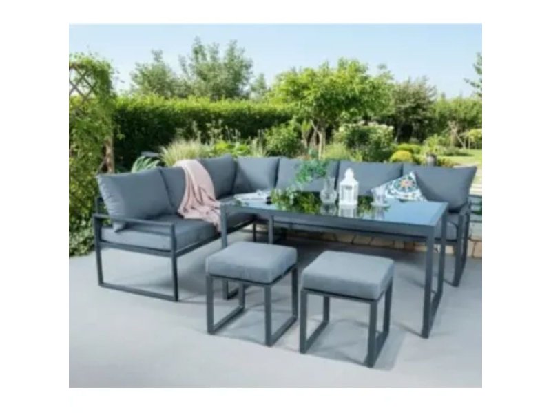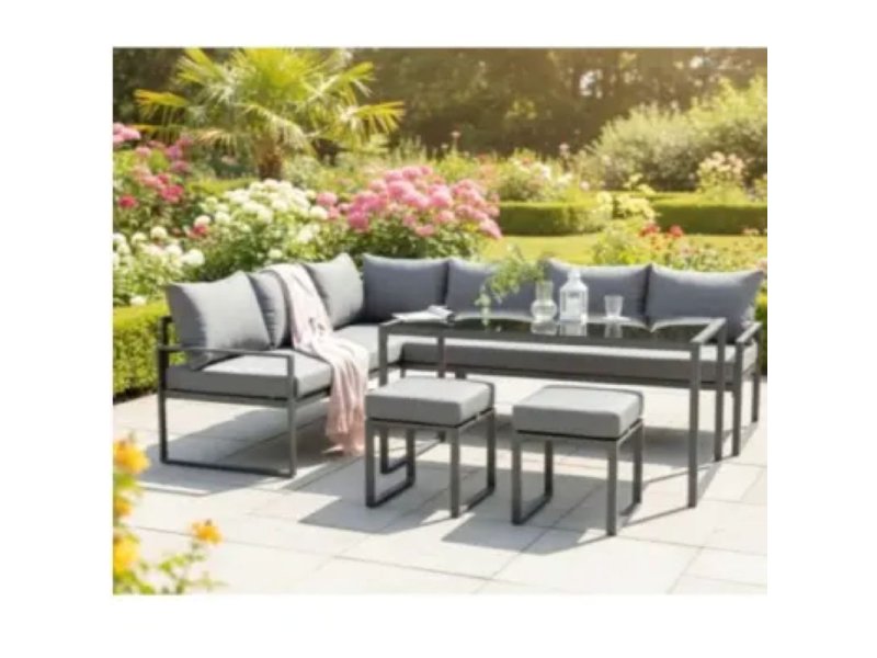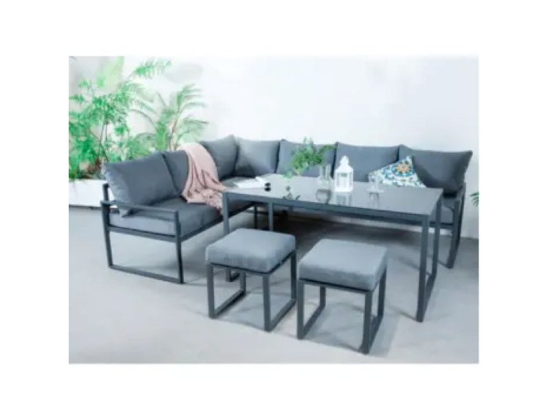 | Karakteristike | Moderan i minimalistički dizajn. Ugaona baštenska garnitura za optimalno korišćenje prostora. Pogodna i za opušteno sedenje i za obedovanje.. Stabilna čelična konstrukcija otporna na svakodnevnu upotrebu Sto sa čvrstom staklenom pločom debljine 5 mm i svilenim printom. Udobna sedišta sa jastucima debljine 10 cm. Kvalitetna spun poliester tkanina (220 g) prijatna za sedenje. Dva praktična taburea kao dodatna mesta za sedenje ili oslonac za noge. Jednostavno uklapanje u različite eksterijere. Idealna za terase, bašte i zatvorene prostorije. |