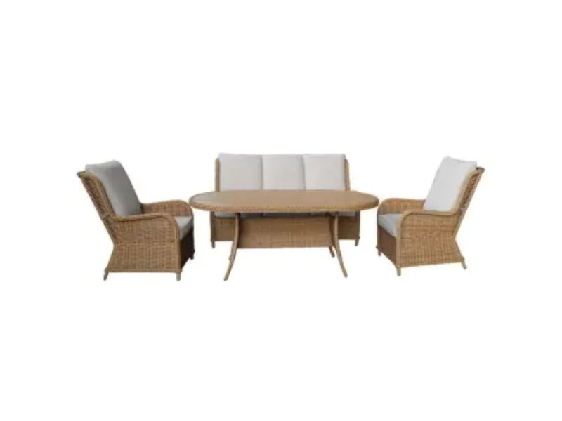 | Karakteristike | Elegantan i luksuzan dizajn sa prirodnim izgledom ratana. Čvrst aluminijumski ram otporan na rđu i vremenske uslove. Oplet od kvalitetnog PE ratana za dugotrajnost i jednostavno održavanje. Ergonomski oblikovana sedišta i zaobljeni nasloni za maksimalnu udobnost. Debeli i luksuzni jastuci: 11 cm sedišni i 19 cm naslonski. Olefin tkanina gustine 200 g/m² otporna na UV zračenje i spoljašnje uticaje. Dekorativni paspul (piping) za sofisticiran i profinjen izgled. Veliki sto sa polywood pločom (6 panela) sa efektom prirodnog drveta. Stabilna konstrukcija pogodna i za trpezarijsku upotrebu. KD (knock-down) sistem za lak transport i jednostavno sklapanje. Pogodna za terase, bašte i prostore za druženje na otvorenom. Set sadrži: 1 × trosed sofa. 2 × singl fotelje. 1 × sto. Set sedalnih i naslonskih jastuka. |