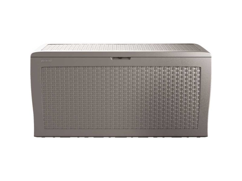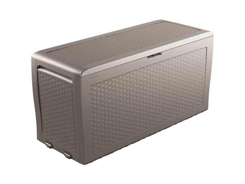 Odličan prostor za odlaganje za jastuke i baštensku opremu. Čvrst i otporan sanduk ratan dezena čiji poklopac izdržava težinu do 200 kg. Potpuno otporan na delovanje atmosferskih uticaja i UV zračenja. Sanduk je izrađen od veštačkog materijala i zato ne zahteva održavanje. Ugrađene ručice i točkići olakšavaju premeštanje. Jednostavna i brza montaža bez upotrebe alata. Može da se zaključa katancem (katanac nije deo kompleta).