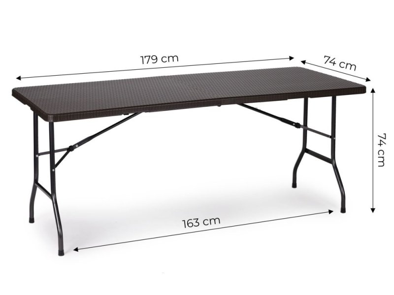 | Karakteristike | Ploča stola izrađena je od izdržljivog HDPE materijala, sa šarom koja imitira ratan. Sto je u potpunosti otporan na spoljašnje vremenske uslove. Cela konstrukcija oslonjena je na čvrst čelični ram sa praškastim premazom. Banketni sto poseduje sigurnosnu bravu koja sprečava spontano i nekontrolisano sklapanje. Sto se može preklopiti na pola i pretvoriti u praktičan kofer sa ručkom. Maksimalna nosivost stola je 100 kg. Prečnik nogu stola iznosi 25 mm. Dimenzije pakovanja: 102 × 84 × 9 cm Težina: 11,6 kg |
