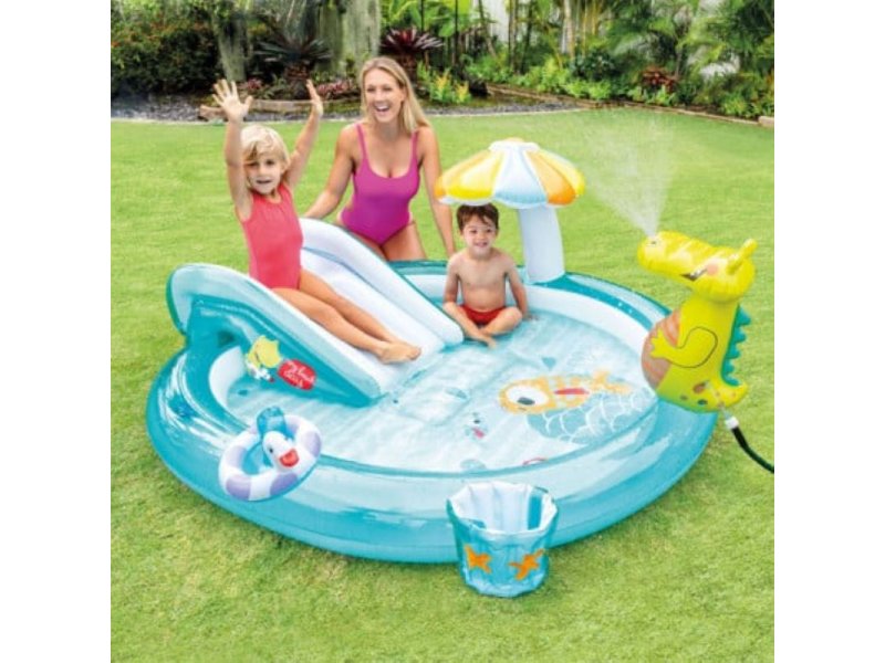 | Karakteristike | Dimenzije naduvanog proizvoda: 201 x 170 x 84 cm Tobogan Zaštita od Sunca u obliku pečurke Aligator prskalica Mali šlauf u obliku patke Kofica na naduvavanje Prskalica za vodu se priključuje na crevo za vodu Zapremina bazena: 160 litara (kada je voda u bazenu dubine oko 12 cm) Maksimalna podržana masa korinika: 54 kg Otvor sa čepom za lakše izbacivanje vode Proizvod je pogodan za decu od 2 godine i stariju |