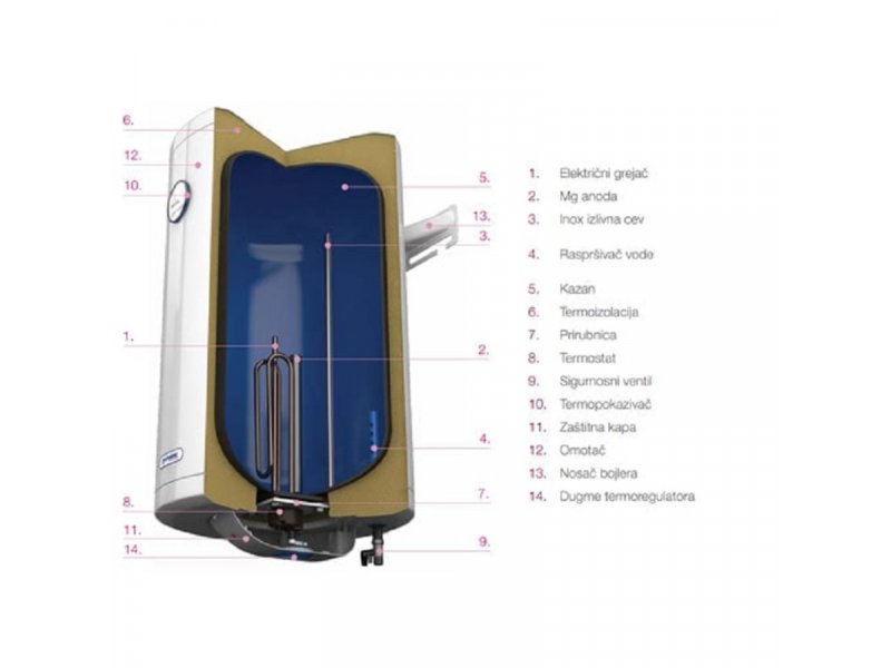 Ostalo | Tip: Akumulacioni Način rada: Pod pritiskom Vrsta kazana: Emajlirani čelik Radni pritisak: 6 bara Tip grejača: Mokri (potopljen u vodu) Ostale karakteristike: Vreme zagrevanja vode do 75°C je 175min. Spoljašnji regulator temperature vode omogućava regulisanje temperature zagrevanja vode u 3 nivoa Na taj način je moguće prilagoditi upotrebu bojlera trenutnim potrebama potrošača. Kazan je od čeličnog lima zaštićenog vodostalnim emajlom koji se smatra najpogodnijim za unutrašnju antikorozionu zaštitu. Toplotna izolacija od poliuretana obezbeđuje da toplotni gubici budu minimalni, odnosno da potrošnja električne energije bude racionalna. Univerzalni nosač omogućuje jednostavnu montažu u slučaju zamene bojlera, čime se izbegava bušenje nepotrebnih rupa u kupatilu. U svaki akumulacioni bojler ugrađena je Mg anoda, koja obezbeđuje zaštitu kazana od korozije. Masa: Bruto: 29.4 Kg |