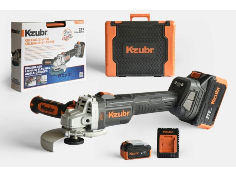 Aku ugaona brusilica KBLEAG-21V sa motorom bez četkica pruža brzinu od 5500–9000 o/min, uz prečnik diska od 125 mm i navoj vretena M14. Dolazi u kompletu sa 2 snažne Li-Ion baterije i brzim punjačem (60 min). Snažna, pouzdana i praktična za sečenje i brušenje metala, betona i drugih materijala.