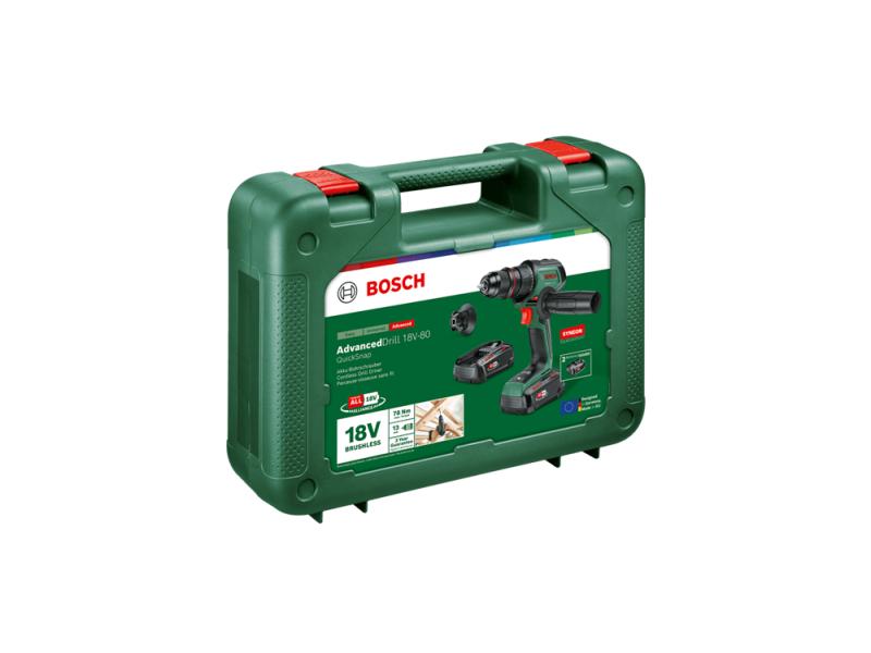 Bosch AdvancedDrill 18V-80 objedinjuje snažno bušenje i uvrtanje šrafova sa optimalnom fleksibilnošću. Uz moćan maksimalni obrtni moment od 78 Nm i promenljivu brzinu, s lakoćom obavlja sve zadatke – od vodećih rupa do uvrtanja šrafova, zavrtanja ili pričvršćivača u drvo, metal ili plastiku. Ovaj robustan alat je projektovan za izdržljivost zahvaljujući motoru bez četkica i odvojivoj metalnoj steznoj glavi. Stezna glava od 13 mm prihvata razne burgije i bitove odvrtača, testere za otvore i pribor. Pričvršćivanje magnetne kapice je praktična funkcija za svako uvrtanje šrafova, jer nije potrebno držati rukom šrafove. Ova bušilica-odvrtač visokih performansi poseduje QuickSnap interfejs kako bi stezna glava mogla da se promeni i da mogu da se koriste dodatno dostupni nastavci za dosezanje teško dostupnih mesta. Dodatna drška poboljšava kontrolu i stabilnost pri radu, što znači dodatnu udobnost i manje zamaranja. Integrisana Bosch Syneon tehnologija pruža optimalnu snagu i maksimalno vreme rada. Alat pripada sistemu 18V POWER FOR ALL. Za sve 18V POWER FOR ALL alate može se koristiti jedan akumulator.