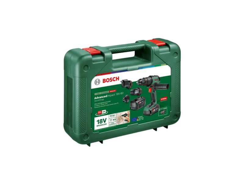 Bosch AdvancedImpact 18V-80 kombinuje snažno bušenje i uvrtanje šrafova sa optimalnom fleksibilnošću. Uz moćan maksimalni obrtni moment od 82 Nm i promenljivu brzinu, s lakoćom može da obavlja razne zadatke – od vodećih rupa do uvrtanja šrafova, zavrtanja ili pričvršćivača u drvo, metal, plastiku ili zidove. Ovaj robustan alat je napravljen da tako da traje zahvaljujući motoru bez četkica i odvojivoj metalnoj steznoj glavi. Stezna glava od 13 mm prihvata razne burgije i bitove odvrtača, testere za otvore i pribor. Pričvršćivanje magnetne kapice je praktična funkcija za svako uvrtanje šrafova, jer nije potrebno držati rukom šrafove. Ova akumulatorska vibraciona bušilica-odvrtač visokih performansi poseduje QuickSnap interfejs kako bi bila moguća promena stezne glave i da mogu da se koriste dodatno dostupni nastavci za dosezanje teško dostupnih mesta. Dodatna drška poboljšava kontrolu i stabilnost pri radu, što znači dodatnu udobnost i manje zamaranja. Integrisana Bosch Syneon tehnologija pruža optimalnu snagu i maksimalno vreme rada. Alat pripada sistemu 18V POWER FOR ALL. Za sve 18V POWER FOR ALL alate može se koristiti jedan akumulator.