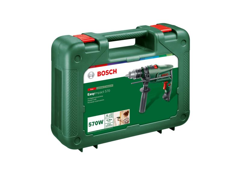 EasyImpact 570 omogućava udobno bušenje u zidovima, drvetu, metalu i mekom betonu. Brzostezna glava sa Autolock sistemom obezbeđuje brzo menjanje burgija jednom rukom, dok se vreteno bušilice automatski blokira za čvrst prihvat burgija. Poseduje Bosch elektroniku sa regulisanjem broja obrtaja, koja isporučuje tačnu brzinu za materijal preko okidača osetljivog na pritisak. Ergonomski dizajnirana, lagana sa težinom od samo 1,6 kg i kompaktna za bušenje iznad glave bez napora. Motor od 570 W obezbeđuje pouzdane rezultate u nekoliko materijala, omogućavajući dubine bušenja do 12 mm u zidovima i do 25 mm u drvetu.