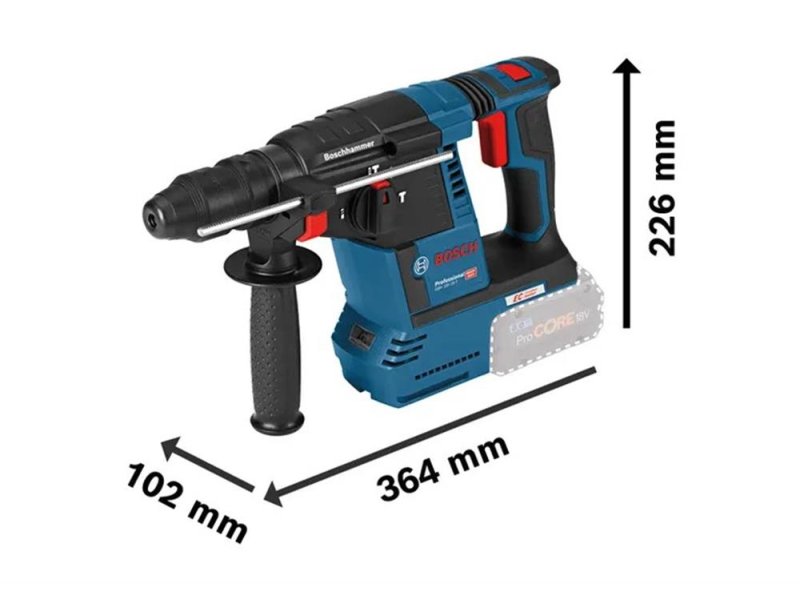 | Karakteristike | Napon akumulatora: 18 V Energija udarca: 2.6 J Držač alata: SDS plus Broj udaraca pri nominalnom broju obrtaja: 0 - 4.350 min⁻¹ Nominalni broj obrtaja: 0 - 980 min⁻¹ Energija udarca, nominalna: 2.6 J Prečnik bušenja u betonu sa hamer burgijama: 4 - 26 mm Optimalno područje primene u betonu sa hamer burgijama: 8 - 16 mm Masa bez akumulatora: 3 kg Obim isporuke: Bosch GBH 18V-26F Izmenljiva brzostezna glava 13 mm Dodatna drška L-BOXX 238 Sistem za usisavanje GDE 18V-16 Professional Krpa za čišćenje L-BOXX uložak Graničnik za dubinu bušenja |