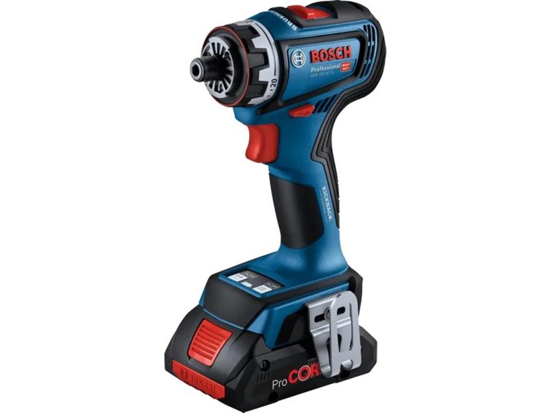 Moćni GSR 18V-90 FC Professional je deo Bosch Professional FlexiClick sistema koji je spreman za sve izazove na gradilištu: Dodatak za ekscentar omogućava rad u blizini ivica i zidova, dok dodatak za pravi ugao konvertuje bušilicu u ugaonu bušilicu. Ovi nastavci mogu da se zaključaju u 16 različitih položaja pod uglom od 360°, bez njihovog uklanjanja sa alata. Pričvršćivanje jedinstvenog dodatka čekića GFA 18-H pretvara alat u pravi SDS plus elektro-pneumatski čekić, spreman za bušenje čekićem u betoni do Ø 10 mm. Veoma kompaktan i snažan alat pri ruci, sa dužinom glave od samo 136 mm i maks. obrtnim momentom od 64 Nm. Bosch Professional FlexiClick System – savršeno opremljen za profesionalni posao.