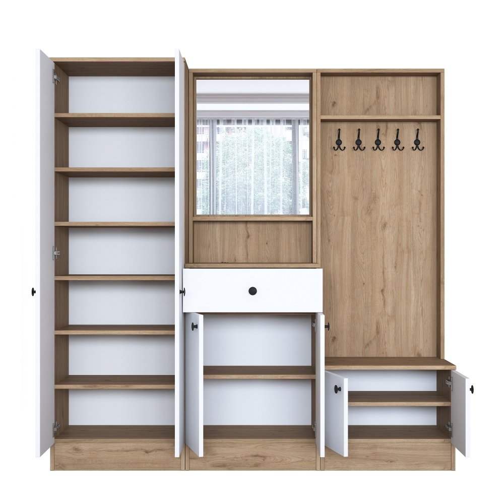 Ovaj sistem za predsoblje izrađen je od 100% iverice sa melaminskim premazom debljine 18 mm, što osigurava otpornost i dugotrajnost. Sa dimenzijama širine 179,4 cm i visine 182,8 cm, pruža dovoljno prostora za odlaganje i održavanje urednog ulaznog prostora.