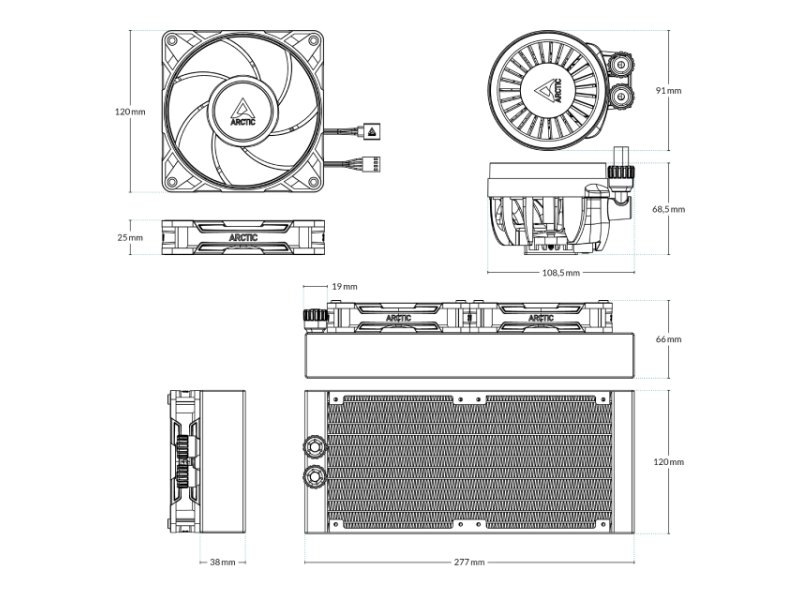| Karakteristike | Tip Vodeno hlađenje Procesorsko ležište (socket) AMD AM4, AMD AM5, LGA1700, LGA1851 Upotreba Za centralne procesore (CPU) Ventilatori Broj ventilatora 2 Dimenzije 120mm x 120mm x 25mm Broj obrtaja 600rpm - 3000rpm Protok vazduha 77cfm Vazdušni pritisak 6.9mmH2O Ležište FDB - Fluid Dynamic Bearing Boja Crna, ARGB Pumpa Dimenzije 108.5mm x 91mm x 68.5mm Radijator Materijal Aluminijum Dimenzije 277mm x 120mm x 38mm Fizičke karakteristike Boja Bela |