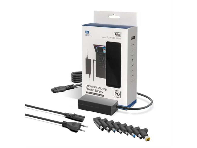 | Karakteristike | Snaga: 90W (automatsko prilagođavanje snage do maksimalnih 90W) Kompatibilnost: Dolazi sa 8 različitih zamenljivih nastavaka (pinova), što ga čini kompatibilnim sa većinom poznatih brendova kao što su: Lenovo (uključujući onaj specifični četvrtasti žuti konektor), ASUS, Acer, HP, Dell, Toshiba, Samsung, Sony, VAIO Ulazni napon: "Worldwide use" – podržava standardne napone (verovatno 100-240V), što znači da se uz odgovarajući adapter može koristiti bilo gde u svetu |