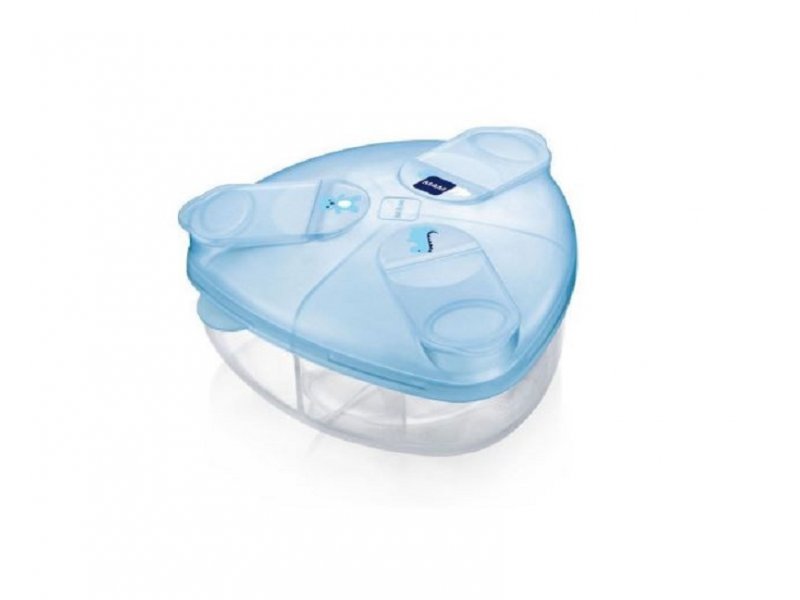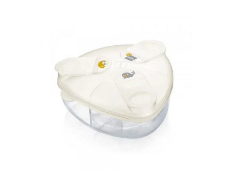 | Karakteristike | Dozer je trouglastog oblika za lako punjenje flašica. Zaštitne kapice za lako otvaranje, punjenje i zatvaranje. Količina punjenja: do 40 g po obroku. Pogodan za sterilizaciju i mašinu za pranje sudova. Takođe pogodan za čuvanje grickalica ili kaše. Posuda je dostupna u beloj, ružičastoj i plavoj boji. |