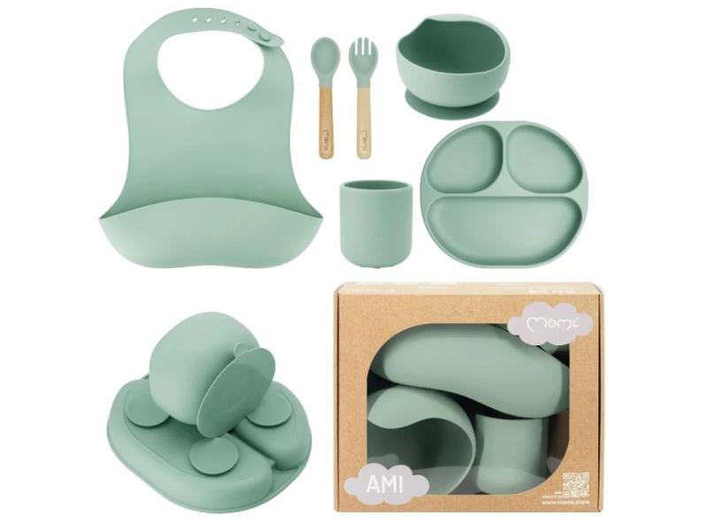 | Karakteristike | MoMi Ami set za hranjenje u zelenoj boji dizajniran je da pomogne deci da nauče da jedu sama. Komplet sadrži: posudu i tanjir sa gumicama, šolju, pribor za jelo sa drvenim drškama i udobnu i mekanu portiklu sa džepom. MoMi Ami posude su napravljene od silikona koji je bezbedan za kontakt sa hranom. Neklizajuće gumeno dno ispod posuda drže ih bezbedno na mestu na stolu ili tacni stolice za hranjenje. Veličina pribora za jelo prilagođena je malim ručicama mališana, tako da vaše dete može bezbedno da ih koristi samostalno. Ne sadrže BPA. Posuđe dolazi u poklon kutiji!