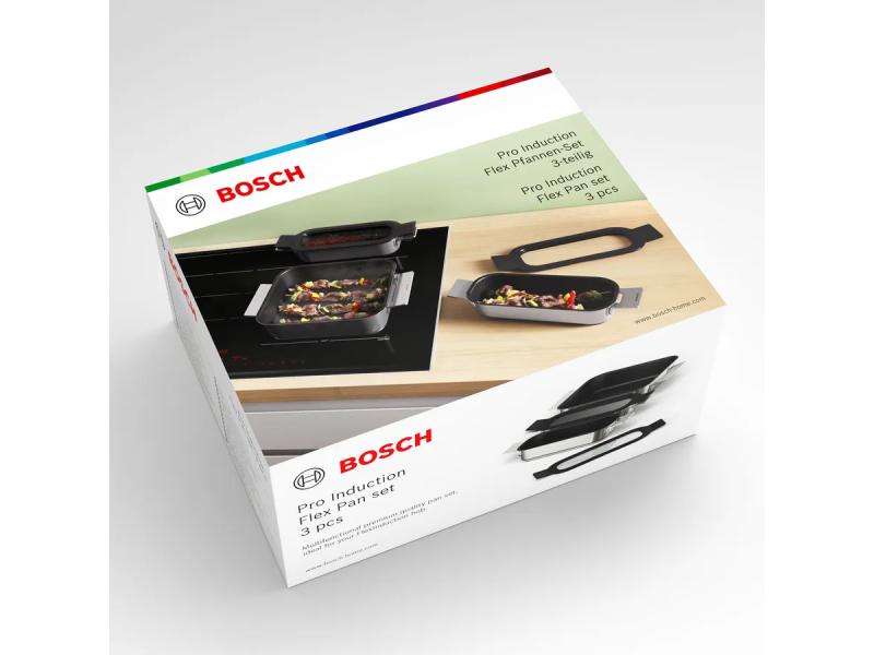 Bosch HEZ9FF030 je komplet tiganja i šerpi dizajniran za korišćenje na svim vrstama kuhinjskih ploča uključujući indukciju i omogućava pečenje u rerni do 220°C bez staklenih poklopaca