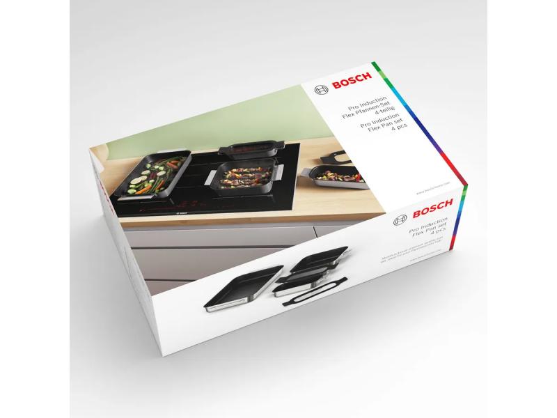 Specifikacija Bosch HEZ9FF040 je komplet tiganja i šerpi dizajniran za korišćenje sa svim vrstama kuhinjskih ploča uključujući indukciju i omogućava pečenje u rerni do 220°C bez staklenih poklopaca.