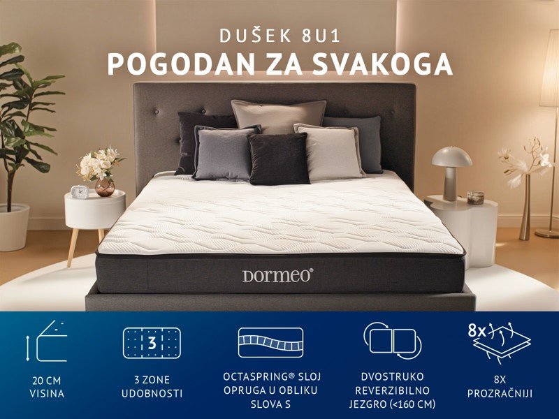| Specifikacija | Dimenzije: 140 x 190 cm Debljina: 20 cm 4 nivoa tvrdoće 2 nivoa podrške 3 zone Octaspring pene 8 kombinacija tvrdoće Dvostrano jezgro Memorijska pena Srebrna vlakna Personalizovana ergonomska podrška za svaki položaj spavanja Ciljano rasterećenje pritiska na leđima, ramenima i kukovima 8x veća prozračnost od tradicionalne pene Do 3°C osvežavajući san tokom cele noći Trenutno prilagođavanje na pokrete - bez propadanja ili ukočenosti Svežiji, obnavljajući odmor svake noći Ekološki dizajn: Octaspring koristi 50% manje materijala od tradicionalne pene |
