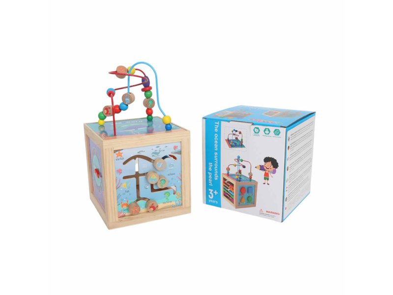 Karakteristike Drvena edukativna didaktička kocka sa motivom okeana nudi više igara u jednom: lavirinti sa perlicama i motivima, abakus, sat i slaganje oblika. Podstiće razvoj motoričkih veština, koordinacije i prepoznavanja oblika i boja.