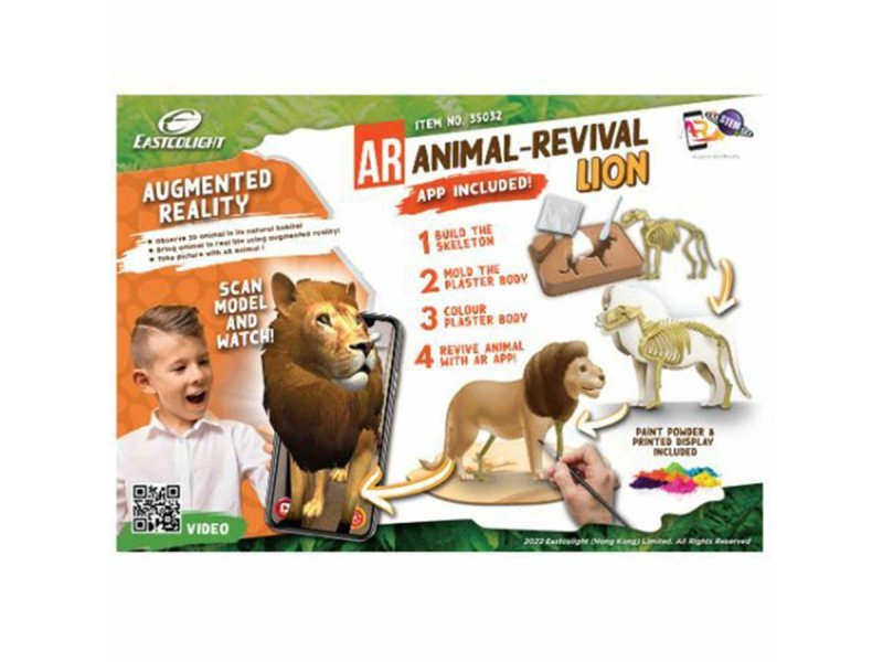 Set sadrži sve što je potrebno za izradu impresivne skulpture lava. U pakovanju se nalazi 12 delova kostiju, gips u prahu za čvrstinu, tri pakovanja boja u prahu za živopisne detalje, kalup za oblikovanje, kašika za mešanje, četkica za slikanje i plastična paleta za mešanje boja. Takođe, tu je i podloga za izlaganje gotovog remek-dela.