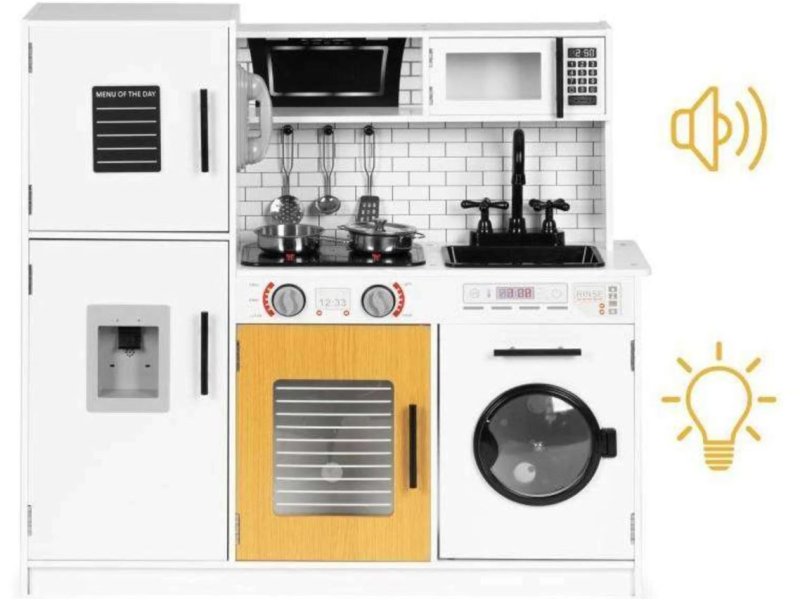 Karakteristike | Maštovita igračka za razvoj kreativnosti Ova velika drvena kuhinja savršena je igračka za male kuvare, pružajući im priliku da istražuju i uče kroz igru. Svetlosni i zvučni efekti čine igru još zanimljivijom i realističnijom, podstičući dečju maštu. Interaktivne funkcije za nezaboravnu zabavu Opremljena različitim funkcionalnostima, uključujući otvaranje vrata frižidera, rerne, mikrotalasne i mašine za pranje veša, kao i sudoper sa funkcionalnom slavinom. Ove karakteristike nude deci realistično iskustvo kuvanja i domaćinstva. Obrazovna vrednost i izdržljivost Komplet dolazi sa metalnim kuhinjskim priborom, uključujući lonac, tiganj i ostale alatke, što doprinosi razvoju ručnih veština i koordinacije. Čvrsta drvena konstrukcija garantuje dugotrajnost igračke. Karakteristike: Materijal: Drvo Svetlosni i zvučni efekti Uključuje metalni kuhinjski pribor Funkcionalne karakteristike: Otvaranje vrata, sudoper sa slavinom Pakovanje: Ojačana kutija, dimenzije 86x32x17 cm, težina 14 kg |
