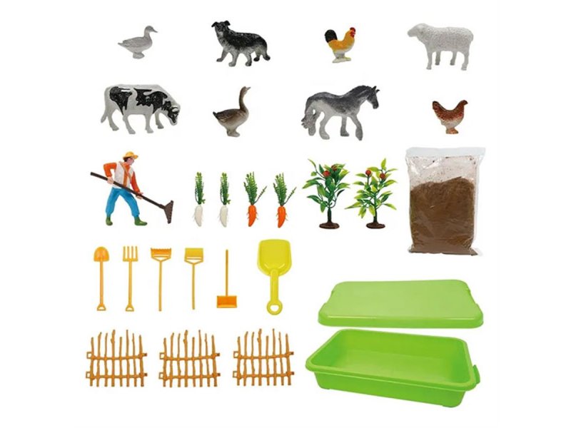 Set sadrži ukupno 26 delova, uključujući figurice životinja, alate i dodatke koji omogućavaju deci da kreiraju autentično okruženje farme. Svaki deo je pažljivo dizajniran kako bi bio jednostavan za rukovanje i bezbedan za decu. Ovi elementi omogućavaju mališanima da razvijaju svoju maštu i kreativnost dok se igraju.