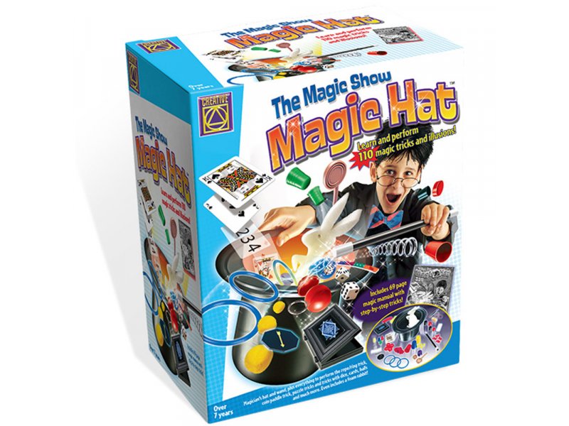 Mađioničarski set koji sadrži rekvizite za neverovatnih 110 trikova: mađioničarski šešir sa duplim dnom, trikove sa kartama, štapićima, krugovima, zecom, magičnim čašama...