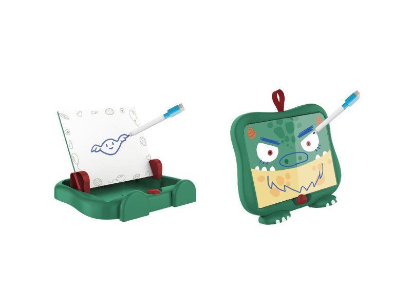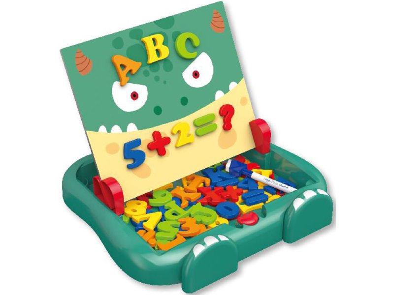 Set sadrži: zeleni koferčić, magnetnu tablu sa dva lica, 20 magnetnih brojeva, 6 magnetnih simbola, marker, 2 držača i 26 magnetnih slova abecede. Igra magnetnim setom Dino stimuliše samostalnu igru, razvoj fine motorike i maštu.