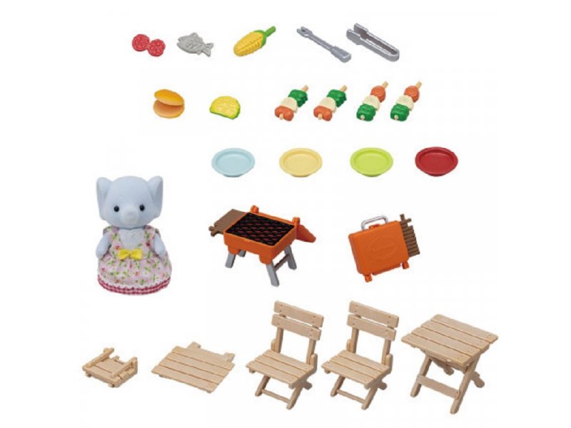 | Karakteristike | Set za piknik za roštilj sadrži devojku slona Miriam u ekskluzivnoj odeći, zajedno sa dodacima za uživanje u lažnoj igri na roštilju. Neka vaša figura kuva hranu na roštilju i jede za stolom i stolicama. Uključuje šarene tanjire i sastojke. Sto i stolice se mogu sklopiti, a poklopac za roštilj se može otvoriti i zatvoriti. Kombinujte sa porodicom slonova (prodaje se zasebno) za zabavu sa sve četiri figure slona. Ili kombinujte sa setovima kao što su Adventure Treehouse, Lakeside Lodge ili Famili Campervan (svi se prodaju zasebno) za još zabavnije maštovite igre! Ili koristite sa porodičnim kombijem za piknik (prodaje se zasebno) postavljanjem predmeta na krovni nosač! |