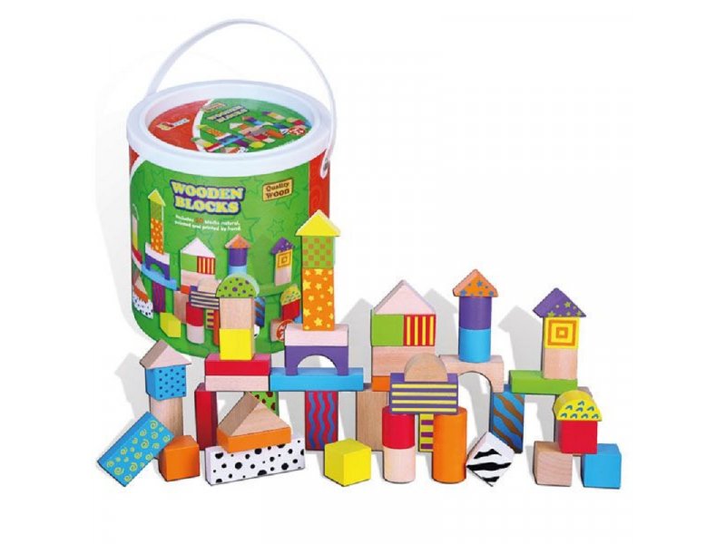 VIGA-set drvenih geometrijskih oblika raznih šara i boja za igru i slaganje. Set sadrži 50 elemenata. Dim: 22x22.