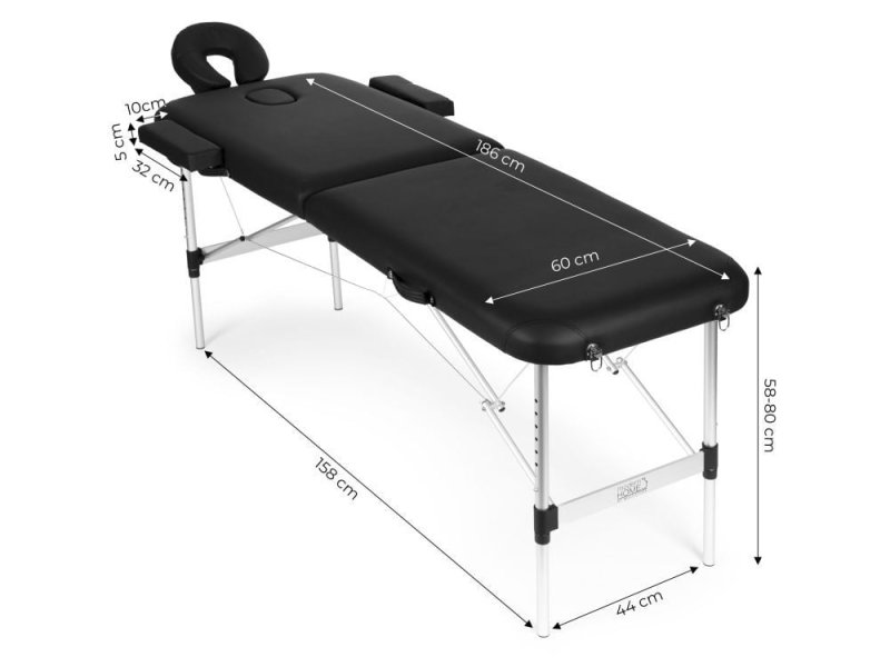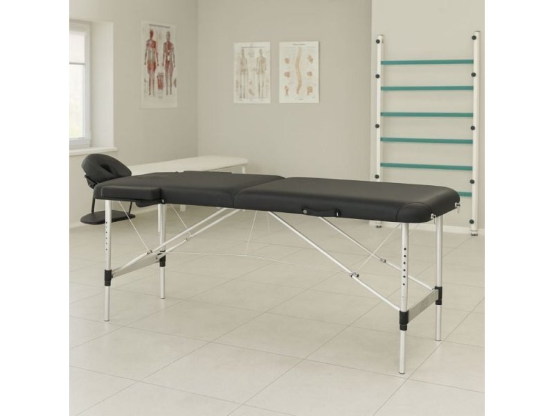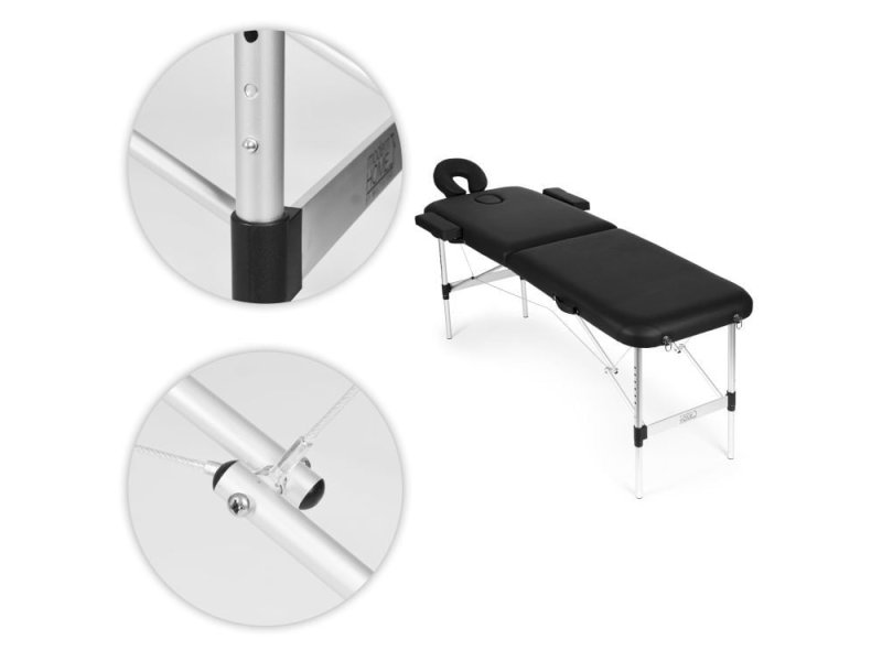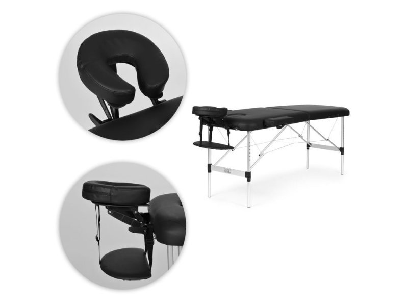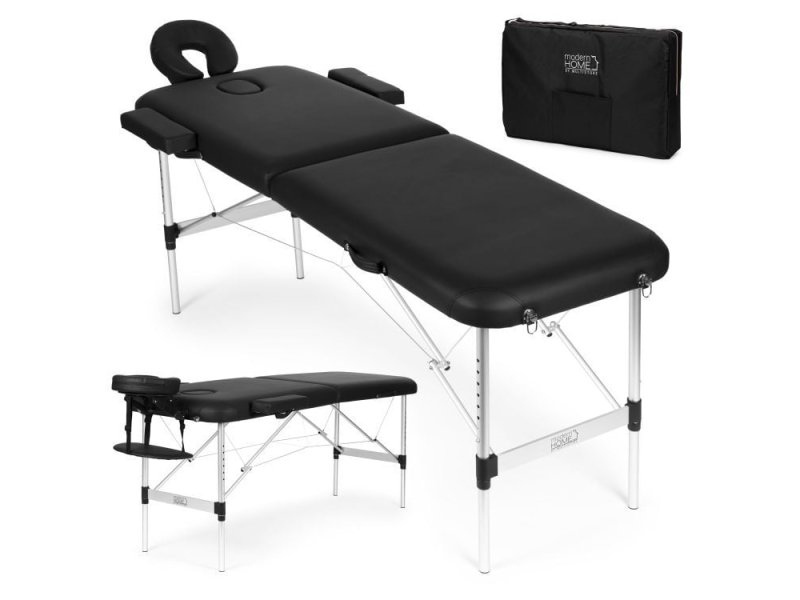 MASAŽNI STO – 2 SEKCIJE MODERNHOME - Profesionalni masažni sto namenjen maserima, fizioterapeutima i terapeutima – idealan za korišćenje u ordinacijama, kao i tokom mobilnih poseta. Izdržljiv aluminijumski ram ojačan čeličnim sajlama obezbeđuje stabilnost i sigurnost tokom rada. Dvosekciona radna površina pruža ravnomernu podršku telu u svakom položaju. Radna površina je presvučena izdržljivom PVC eko-kožom, dok pena debljine 5 cm obezbeđuje visok nivo udobnosti tokom tretmana. Podesivi naslon za glavu i visina stola omogućavaju precizno prilagođavanje potrebama kako klijenta, tako i terapeuta. Otvor za lice u predelu grudi olakšava disanje kada klijent leži licem nadole, dok viseći naslon za ruke omogućava prirodan položaj ruku i dodatni komfor tokom masaže. Sto se sklapa u kompaktan kofer, koji se lako skladišti i transportuje zahvaljujući priloženoj torbi za nošenje.