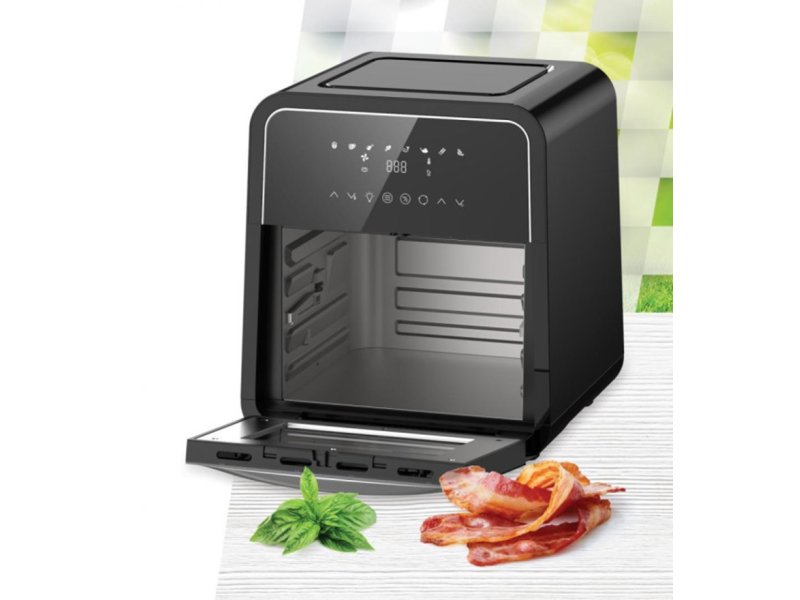 | Karakteristike | Snaga: 2000 W Funkcija: Rerna – kombinovana upotreba kao friteza i mini rerna Kapacitet: 12 litara Displej: Digitalni ekran sa touch kontrolama Tajmer: Do 60 minuta Dehidratacija: Program za sušenje hrane do 24 sata Temperatura: Podesiva od 30°C do 200°C Programi: 8 unapred podešenih programa Nivoi pečenja: 3 nivoa za istovremeno kuvanje Korpa za kuvanje: Korpa za pripremu sa toplim vazduhom Rotaciona šipka: Ražanj za pečenje mesa Rešetke: 3 kom rešetke za kuvanje sa toplim vazduhom Posuda za masnoću: Tava za sakupljanje ulja Ručka: Ručka za korpu Vrata: Odvojiva vrata za lako čišćenje Bezbednost: Automatsko isključivanje |