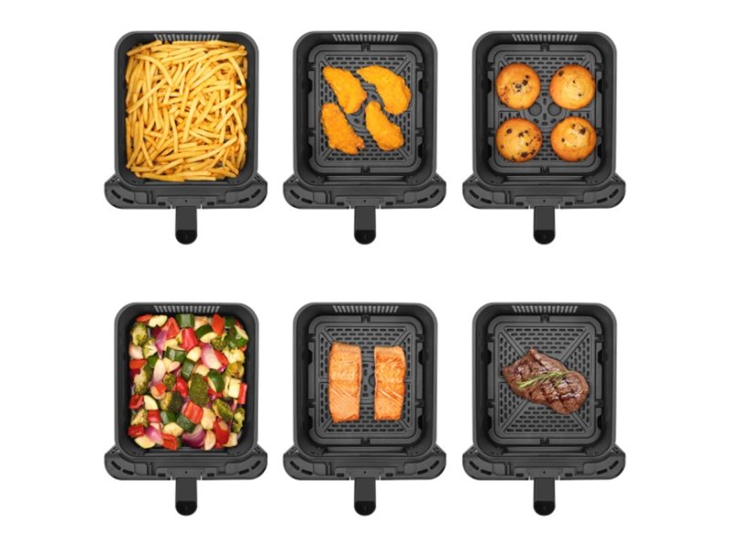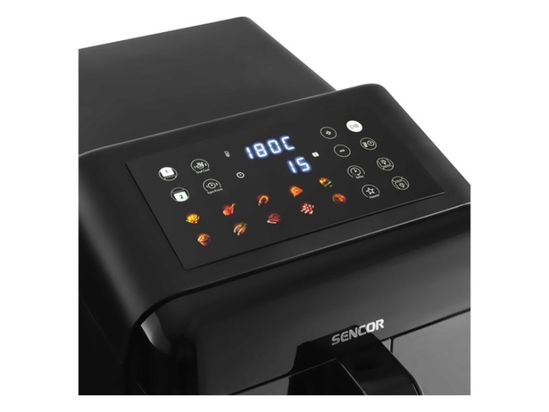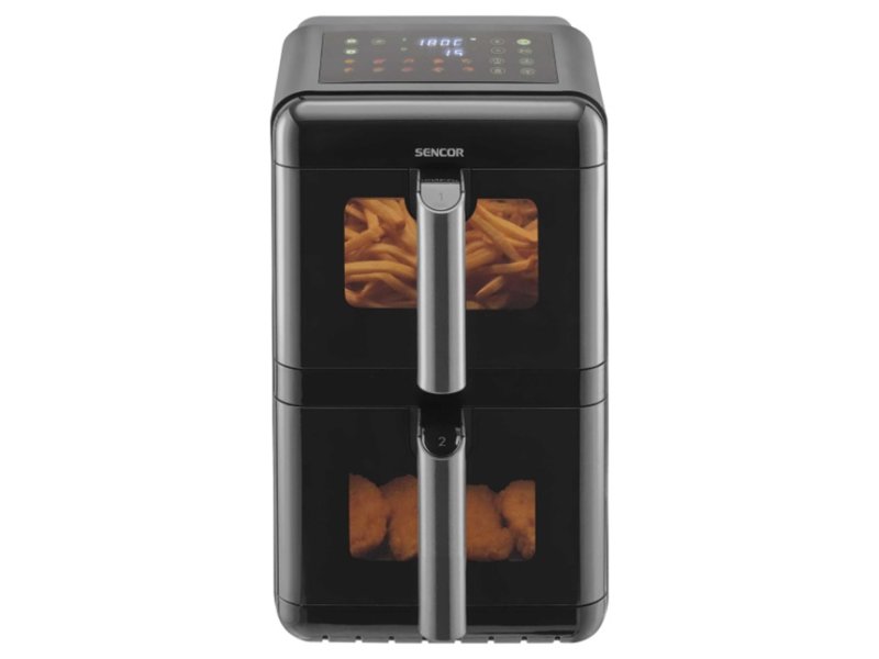 | Karakteristike |  Tip:Friteza na vruć vazduh  Snaga: 3.000W  Temperatura od 40°C do 200°C  Nivoi: 5.8l donji nivo, 5.8l gornji nivo  Fizičke karakteristike:  Dimenzije: 500mm x 450mm x 180mm  Težina: 9.7kg  Pakovanje: 2 korpe  Zapremina :11.6l (dve posude)  Ostalo:  Dodatne funkcije:  Tajmer, Digitalni displej, Drške otporne na toplotu, Automatsko isključivanje nakon 60 minuta  Napomena: 10 programa Mogućnost pranja odabranih delova u mašini za sudove  Podržane tehnologije: Prženje bez ulja |