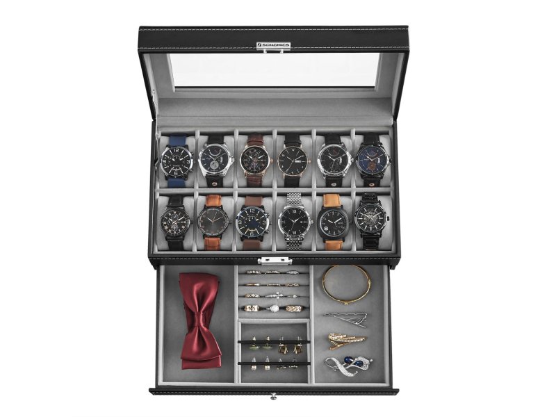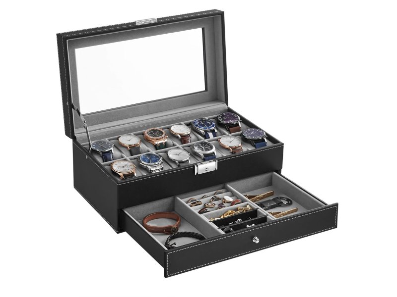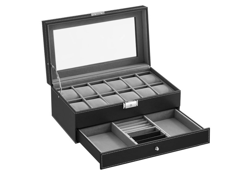 | Karakteristike | Kutija za satove, nakit i druge vrijedne predmete, Veoma elegantna i praktična kutija sa sivim elementima uklopiće se u svaki dekor, biće i savršen i hit poklon za svaku ženu i muškarca, Unutrašnjost kutije je ispunjena somotom. Kutija se sastoji od: providni gornji poklopac, zahvaljujući kome možemo da vidimo sadržaj gornji dio sa 12 jastuka za satove 1 fioka na izvlačenje, koja je podijeljena na pregrade različitih veličina, u koje možemo smjestiti narukvice, prstenje, manžetne, minđuše Boja: crna, siva Materijal: MDF ploča, staklo, presvlake od poliuretana, postava od somota Dimenzije: 32,5 k 18,5 k 13,5 cm (širina x dubina x visina) Težina: 2 kg Kutija se prodaje bez nakita i satova, Zbog svoje boje i karaktera proizvod će biti savršen kao poklon za muškarca. |