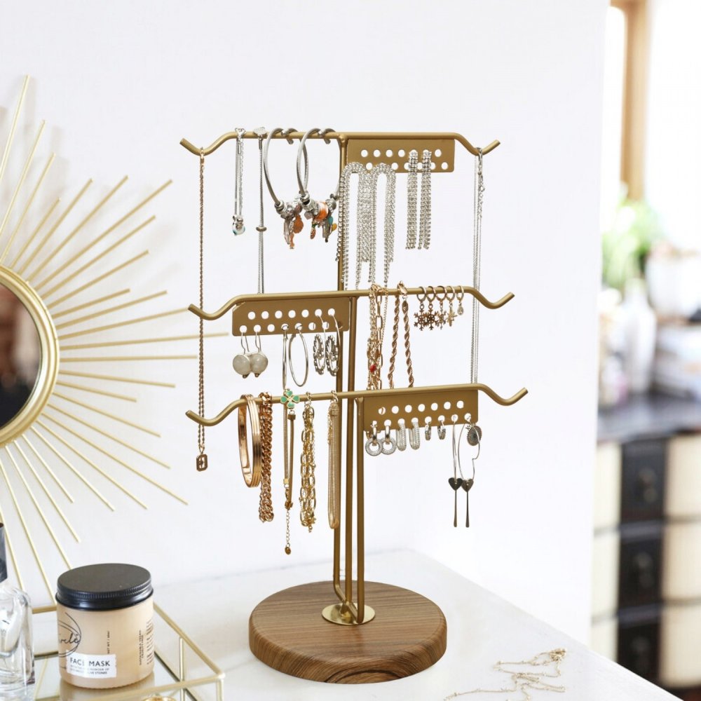 Drvena baza ovog organizatora osigurava stabilnost, dok metalno telo omogućava da vaš nakit bude lako dostupan i uredno složen. Njegove dimenzije pružaju dovoljno prostora za organizaciju prstenja, narukvica, ogrlica i drugih dragocenosti, a kompaktan dizajn čini ga idealnim za svaki prostor.