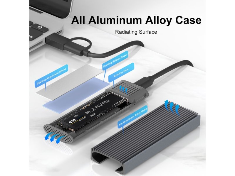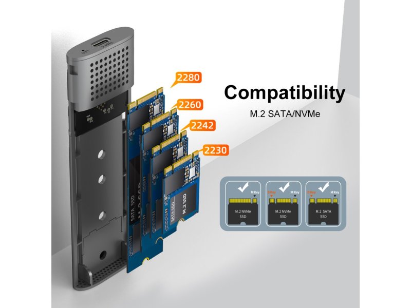 | Karakteristike | Tip fioka za eksterni SSD Format PCI Express Protok 10Gbps Ulaz: B-tipka i B+M-tipka Izlaz: Type-C na Type-C+USB A Podržani protokoli: M.2 NVMe i M.2 SATA Brzina prenosa: NVMe 10Gbps i M.2 SATA 6Gbps Kompatibilni SSD: M.2 NVMe 2230, 2242, 2260, 2280 Podržani sistemi: Windows/Mac OS/Linux/Android |