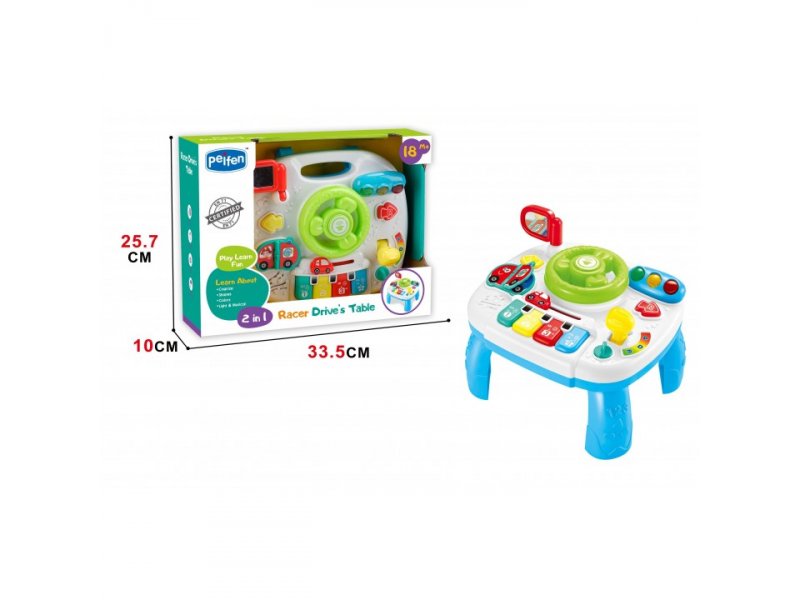 Karakteristike | Multifunkcionalni edukativni stočić sa volanom i elementima za imitaciju vožnje. Poseduje različite aktivnosti: volan u centralnom delu stola, menjač brzina, retrovizor, loptice zvečke, mini klavir, tastere različitih oblika, prozorčić otvori-zatvori... Kada se ne namontiraju nogice interaktivna tabla stola se može okačiti na krevetić, ogradicu, a dodavanjem nogara - sklapa se u sto. U prvim godinama života dete prolazi kroz intenzivan period učenja - od prvih pokreta ruku do prvih koraka i prvih reči, a svaki detalj je važan za njegov zdrav rast i razvoj. Stoga ovaj sto predstavlja idelano sredstvo za igru kroz koju će dete moći da razvije mnoštvo funkcija. Proizvod radi na baterije. |