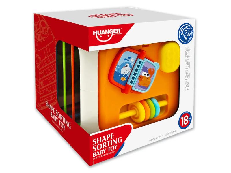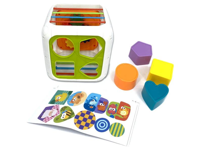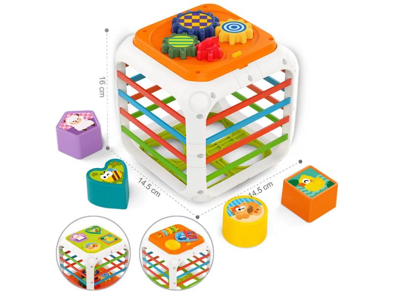 | Karakteristike | Ova interaktivna kocka za sortiranje oblika pomaže detetu da kroz igru razvija logiku, motoriku, koordinaciju i prepoznavanje oblika i boja. Na njenim stranicama nalaze se zadaci kao što su: umetanje oblika, zupčanici koji se mogu okretati, rotirajući elementi i trake koje razvijaju koordinaciju i preciznost. Svaka stranica krije drugačiji izazov, od umetanja raznobojnih figura do pokretnih zupčanika. Idealna je za decu od 18 meseci i savršena za učenje kroz istraživanje! Set sadrži: • Interaktivnu kocku sa 4 različita oblika za ubacivanje • Elastične trakice za guranje i vađenje elemenata • Gornju stranicu sa okretanjem zupčanika • Taktilne površine za dodatnu stimulaciju čula |
