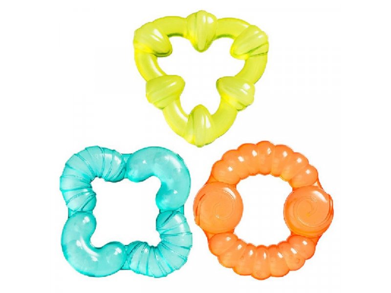 Pakovanje sadrži tri mekane glodalice napunjene vodom. Mogu se hladiti u frižideru. Mekane i pogodne za žvakanje, ublažavaju upale desni prilikom rasta prvih zubića beba. Dim: 1.5x15x7 cm.