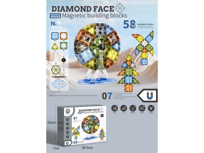 | Karakteristike | Komplet od: 58 delova. U setu: magnetne pločice različitih oblika i boja za sklapanje 3D oblika ili slagalica. Materijal: ABS plastika. Dimenzije pakovanja: 26,5x7x22 cm (vdš). Težina: 1300 g. Magnetni kreativni set – igra i učenje u jednom! Napravite 2D slagalice, napravite panoramski točak ili izmislite potpuno nove oblike. |