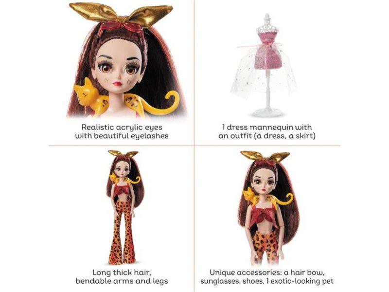 Karakteristike | Upoznajte čarobni svet sa ovim lutkama koje će vas uvesti u svet maštovitosti, raznovrsnosti i uneti zabavu u vašu igru. Takođe kroz igru pruža interaktivno iskustvo, razvoj kreativnosti i podstiče maštovitost kod dece. Svaka od ovih lutaka (Cassie, Balam, Kelia, Bryce i Hera) nosi sa sobom svoju posebnu priču i stil. Balam pronalazi inspiraciju u ljubavi prema životinjama. Njene lepršave leopard pantalone i duga ravna tamno smeđa kosa dodaju dozu divljeg stila. Balam unosi osećaj avanture u dečiji svet. Takđje podstiče empatiju i odgovornost prema životinjama. Inspirisana prirodom, životinjama i neustrašivim samoizražavanjem – Balam nosi temu džungle šik, kao niko drugi. Sa savitljivim rukama i nogama, akrilnim trepavicama, smeđom kosom i mačkom prebačenom preko ramena! Pantalone sa životinjskim printom, stilski top, cipele, mašna i naočare za sunce – njena garderoba zrači originalnošću. Uključuje lutku, haljinu, kaiš, suknju od tila i modnu brošuru sa 7+ jedinstvenih izgleda za kreiranje. Podstiče decu da istražuju modni dizajn, pripovedanje i maštovitu igru kroz prizmu prirode. Visina lutke: 27.9 cm Dimenzije pakovanja: 25 x 7 x 37 cm |