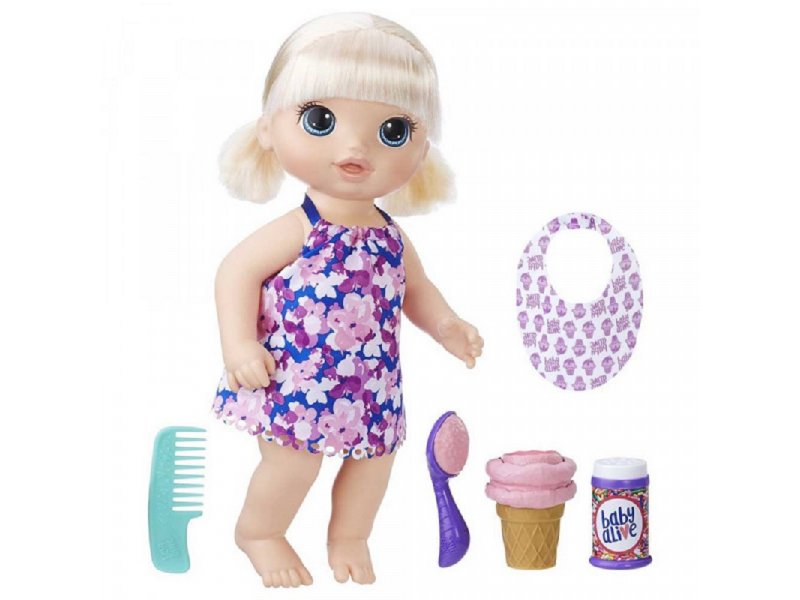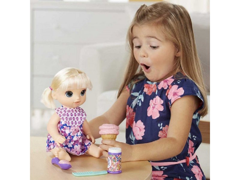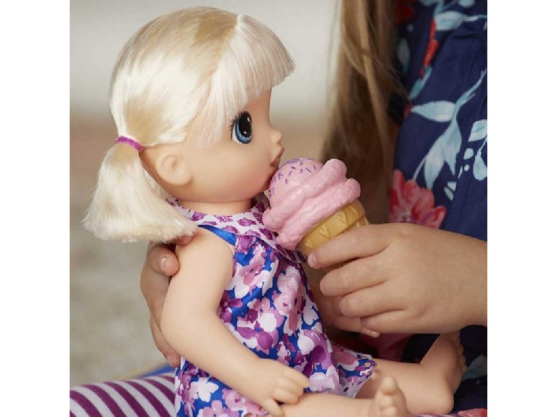 | Karakteristike | Uzrast: 5+ godina Materijal: plastika, sintetička pena, karton Dimenzije: 25,4 x 35,6 x 10,2 cm Set sadrži: bebicu lutkicu, haljinicu i portiklu, češljić, kornet, kašiku za sladoled, teglicu šarenih mrvica |