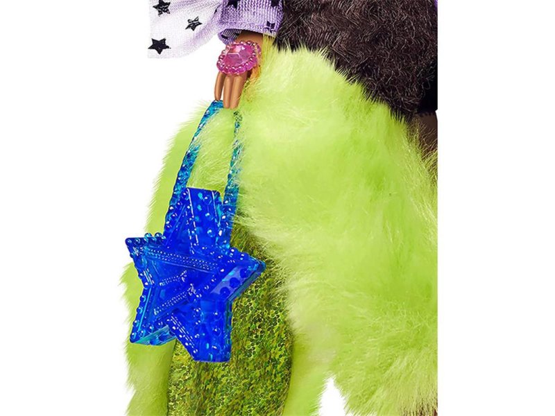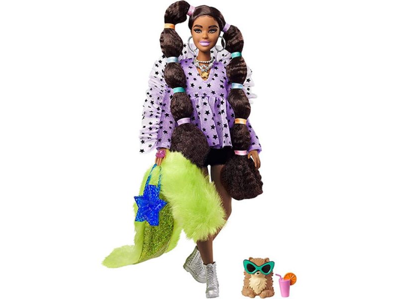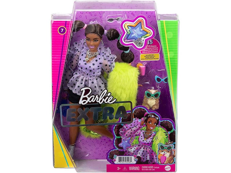 Karakteristike | Barbie Extra je lutka vrhunskog stila sa svojom svetlom ličnošću, uključuje 15 komada uključujući odeću, dodatke i prijatelja životinju sa odgovarajućim dodacima. Ova Barbi lutka ima frizuru sa dugim smeđim pramenovima i gumenim trakama duginih boja Njen izgled je veseo i jedinstven sa gornjim delom od lavande sa volanima ukrašenim zvezdama, crnim šorcom i neonskim šalom od veštačke kože. Barbi dodaci uključuju torbu u obliku zvezde, srebrne čizme, naočare za sunce i srebrni nakit. Njeno štene pomeranca je takođe EKSTRA , sa izuzetno velikim naočarima za sunce i voćnim sokom. Dimenzije: 24 x 33 cm |