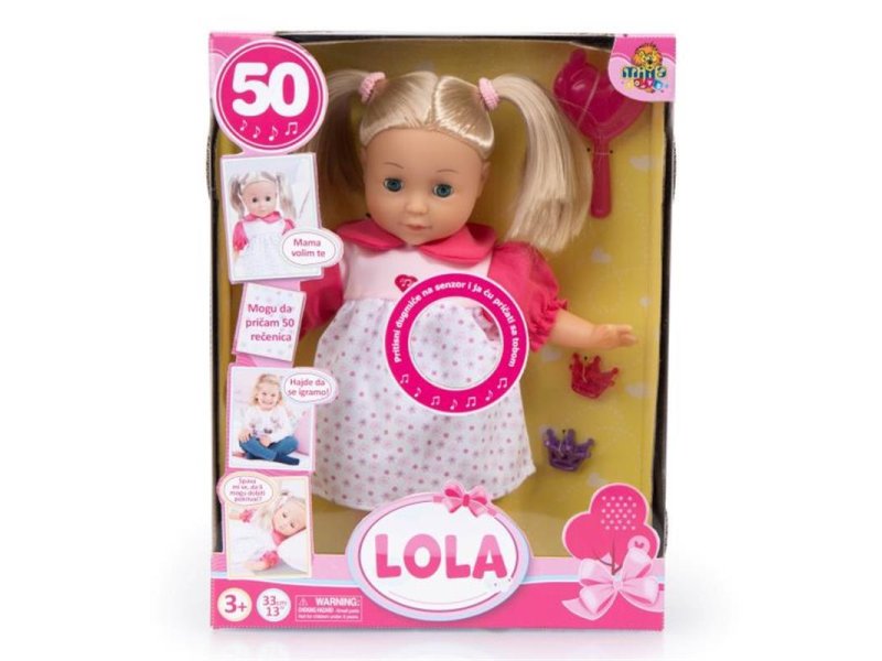 Karakteristike “Zdravo mama!”, - “Zdravo tata!”, - “Volim te!”, “Hajde da se igramo!” - interaktivna lutka Lola izgovara 50 rečenica na srpskom jeziku.
