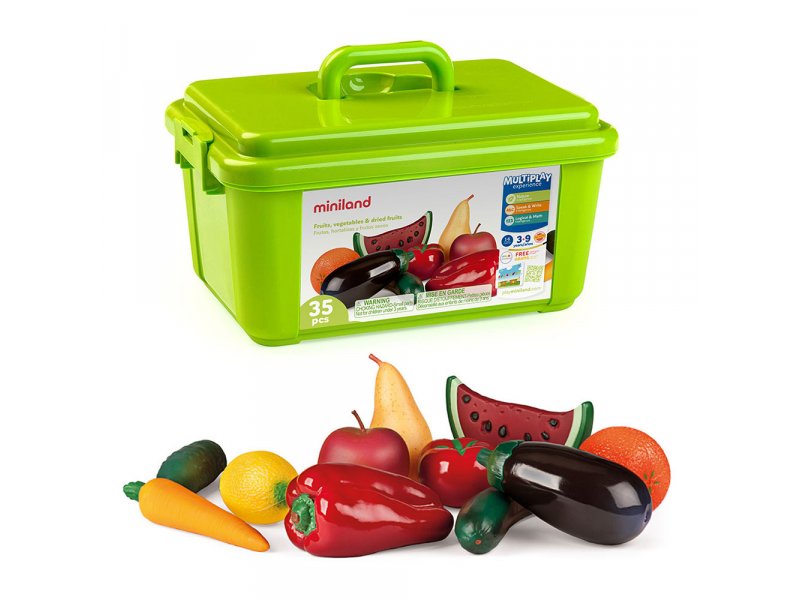 Set se sastoji od kutije koja u kojoj se mogu odlagati elementi i 35 figura voća i povrća