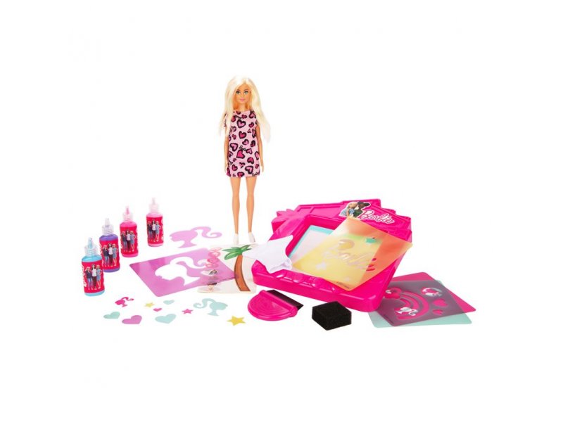 Set sadrži Barbiku, držač za šablone, četiri šablone i četiri boje boje.