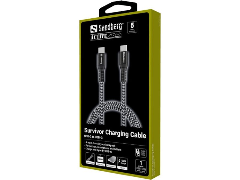 Karakteristike | Sandberg Survivor Cable je kabl za punjenje koji traje! Kabl je napravljen od super jakog kevlara u dvostruko pletenom najlonu, dok su konektori napravljeni od livenog metala. Ekstra jake veze osiguravaju da se utikač ne slomi od kabla. Testiran da povuče preko 70kg i savije preko 60.000 puta. Konektor 1: USB-C Konektor 2: USB-C Podržava PD 100W |